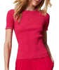 Fitted ribbed jumper crafted from a stretch viscose blend with contrasting detail, a round neckline, short sleeves, and a cut-out at the back. Versatile and stylish, this slim silhouette jumper works as a chic base layer or stand-alone piece for both casual and elevated outfits.