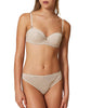 Luxurious lingerie set featuring a rébrodé lace balconette bra with padded bandeau cups, removable adjustable shoulder straps, side stays and heart‑shaped loop detailing. Paired with rébrodé lace Brazilian briefs featuring scalloped lace at the back, a tiny bow and a heart‑shaped logo — perfect for an elegant and seductive set that feels soft against the skin.
