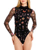 Mei One Piece is a long-sleeve swimsuit with sheer mesh sleeves, a high neckline, and a placement print filled with small surreal-inspired motifs.